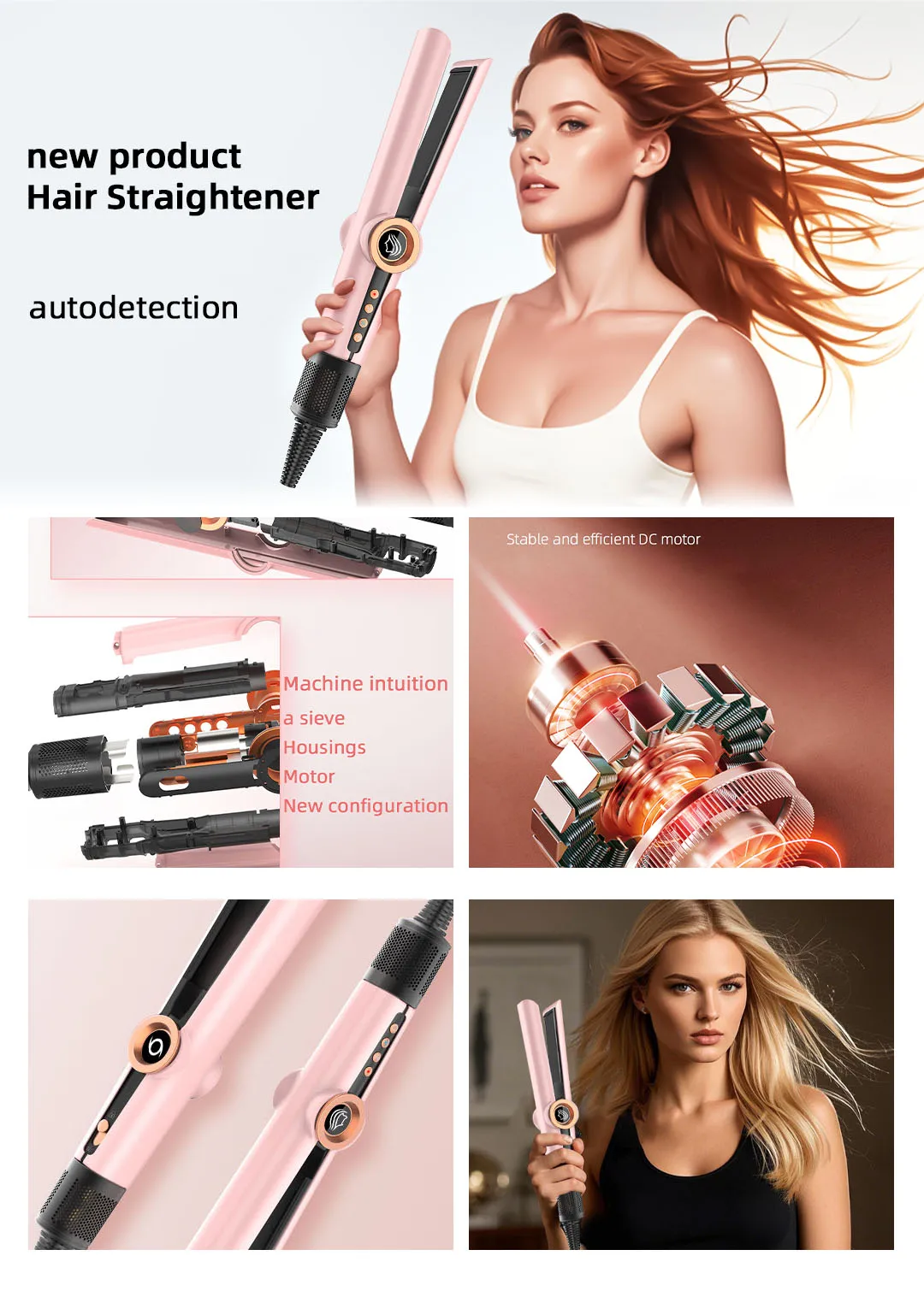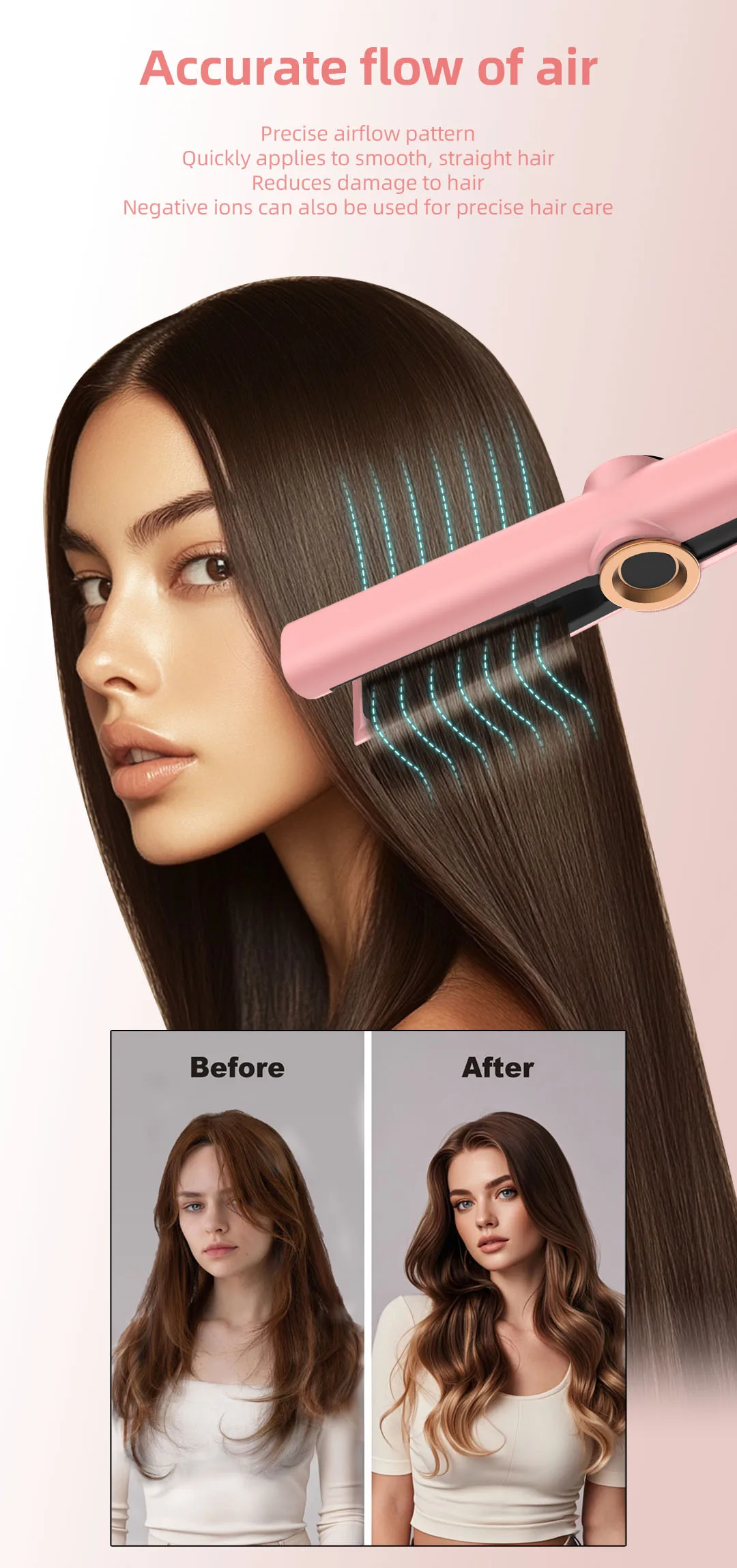 Lisseur sèche cheveux 2 en 1 haute performance qui transforme vos cheveux mouillés en cheveux lisses et brillants en une seule étape. Doté d'une technologie de séchage ultra-rapide, cet appareil portable combine la puissance d'un sèche-cheveux professionnel et d'un lisseur de précision. Idéal pour les femmes actives qui recherchent un gain de temps sans compromis sur la qualité. Chauffage instantané, contrôle de température avancé et design ergonomique pour un confort optimal lors de chaque utilisation.
